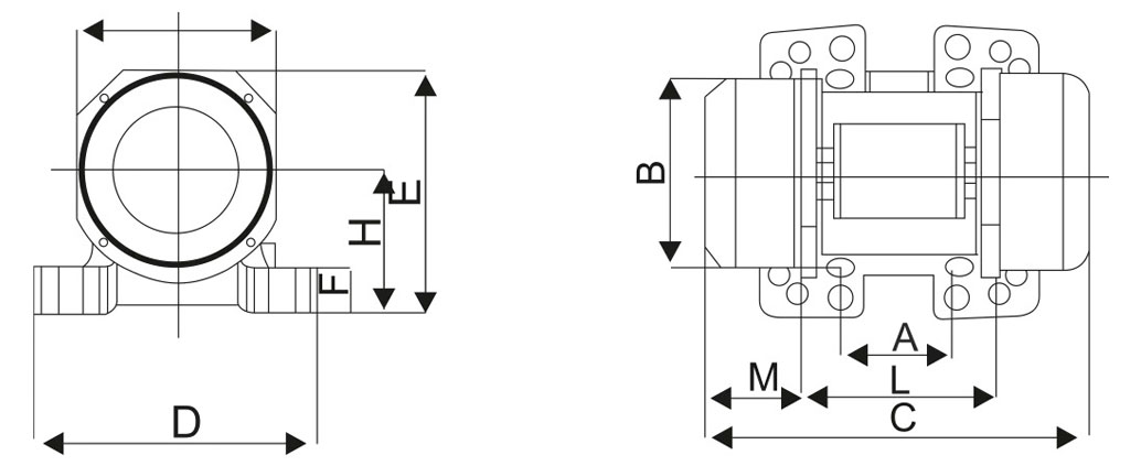 | Тип вибратора | A | B | G | C | D | E | F | H | I | L | M | N | Кабельный вход |